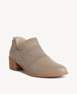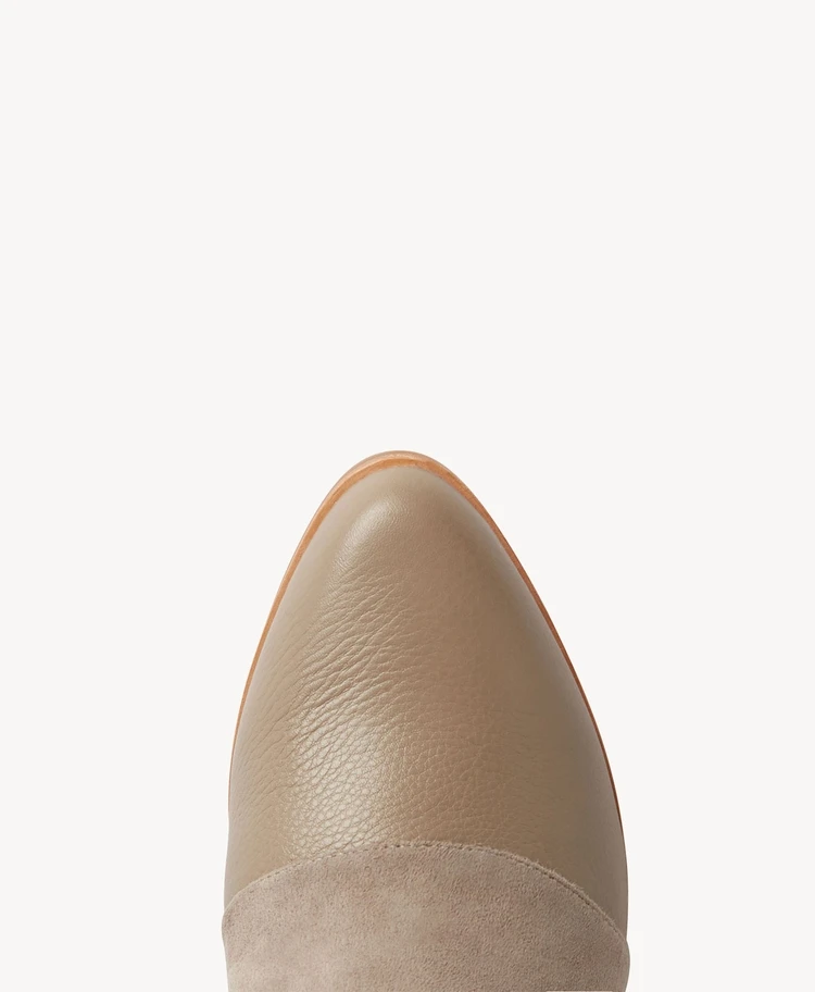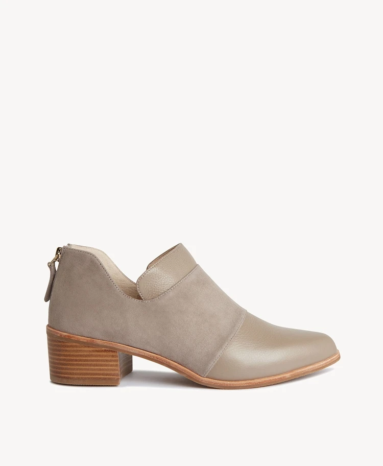 This high coverage style is great for pairing with workwear or evening wear alike. Set on a contrast leather block heel, this combo leather style has a back panel that cuts under the ankle and wraps over the vamp. The zip placed at the back ties together this understated look.