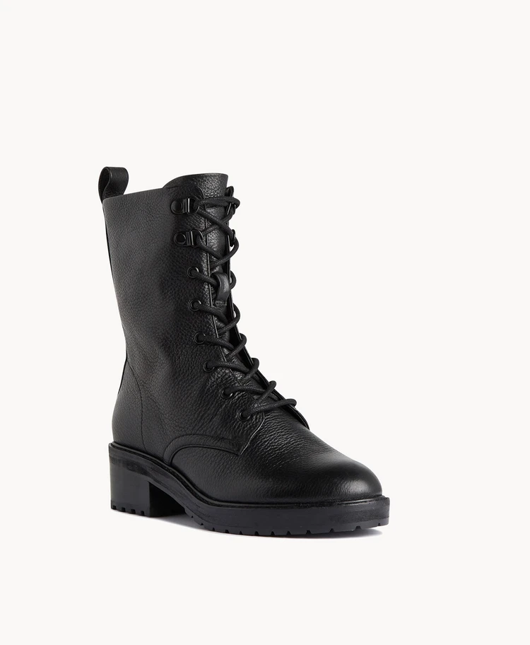 Our Edit ankle boot will add an edge to mid-calf skirts or dresses. Set on a 5cm block heel, this lace-up style has hook-eyelets and a molded tread sole that draws on utilitarian elements while still feeling dressy.