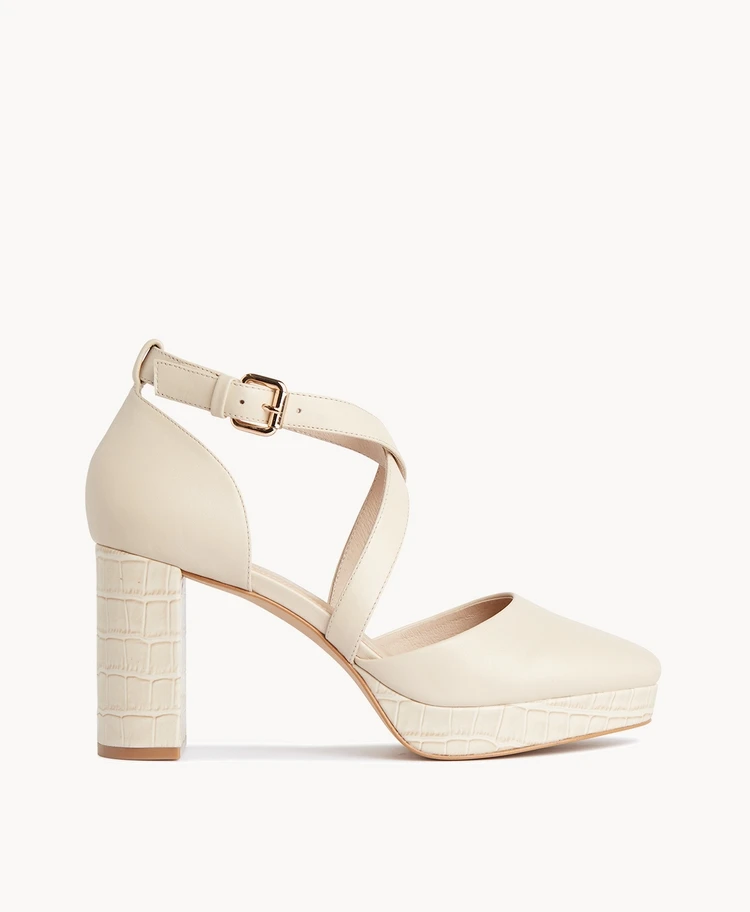 Overlapping straps and a platform sole make Frankie the perfect heel for events. With a soft, almond shaped toe, she’s feminine and flirty.