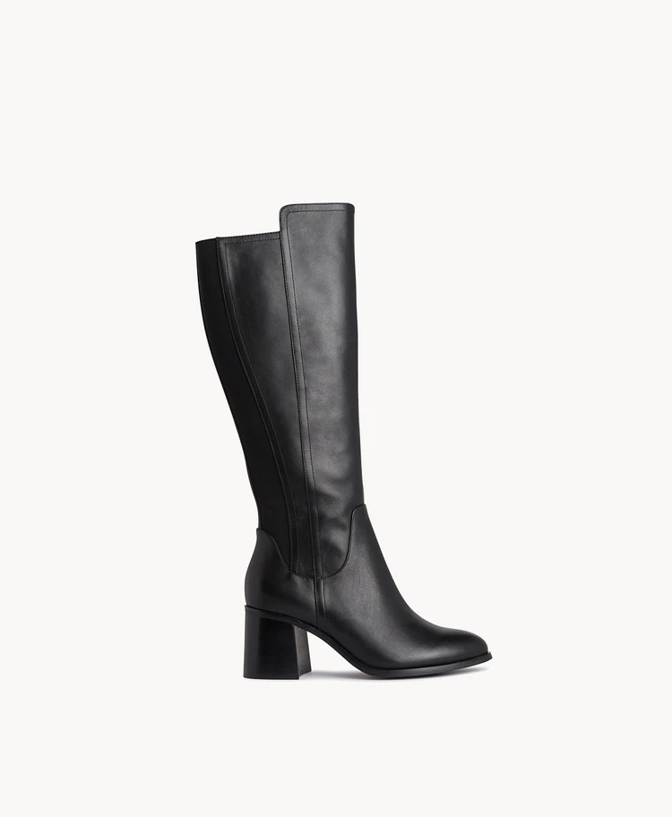 Our Freida boot has wardrobe staple written all over it. The leather upper is complemented with a stretchy, elastic insert designed to accommodate a wider fit. Set on a mid-height block with a softened toe point, try these with denim or a midi skirt.