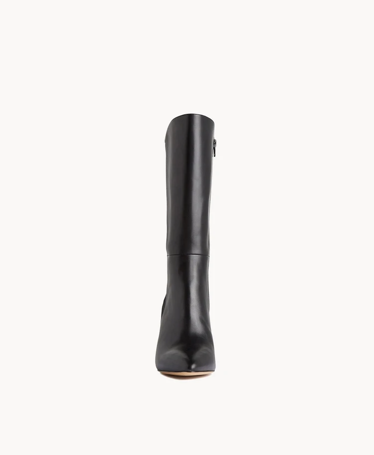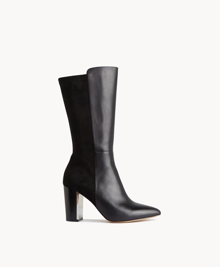 This mid-calf boot has a chic almond toe and block heel with electroplate detail that allows for all day wear. This combo leather boot with suede fabric stretch back ensures a variety of fits and can be paired with workwear or streamline dresses to elevate any look.