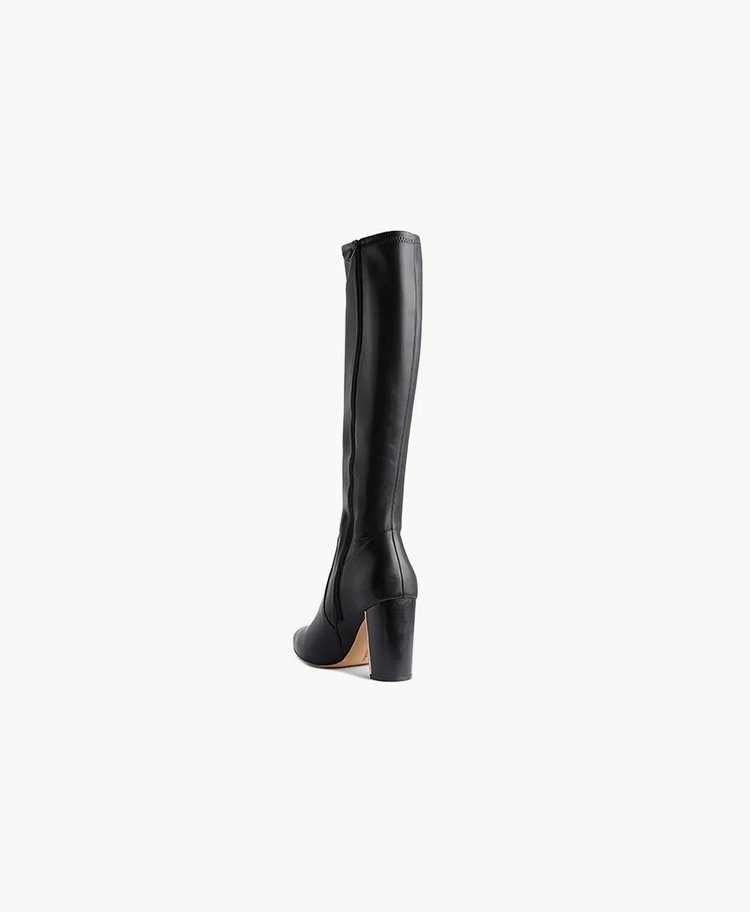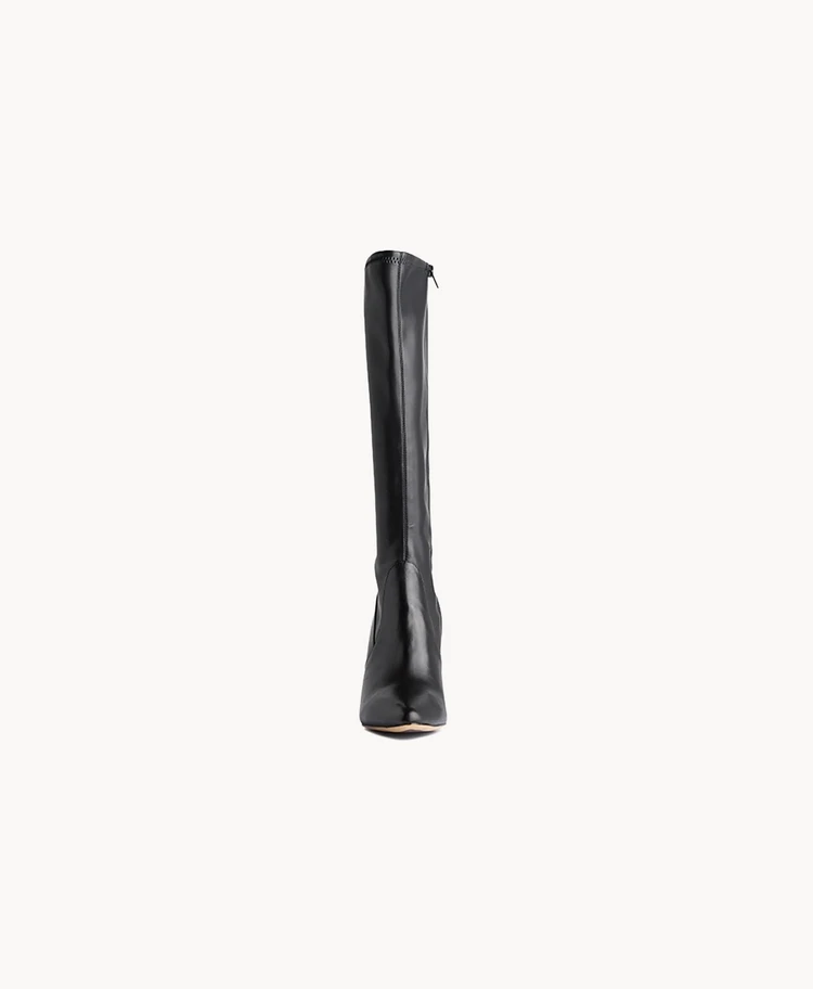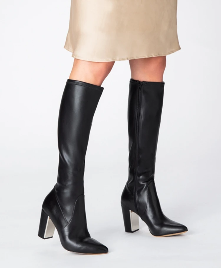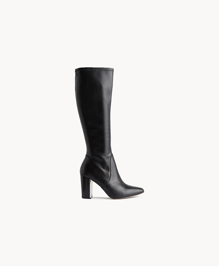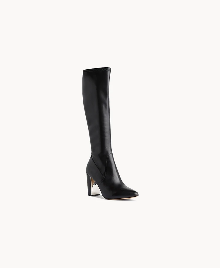 Our Marisa knee-high boot features a slimmer fit and refined silhouette that draw your eyes all the way up for a leg-lengthening affect. With a synthetic stretch leg and dramatic metallic detailed heel, an elegant and versatile choice for day to night wear. This boot has a slim, stretch fit leg.