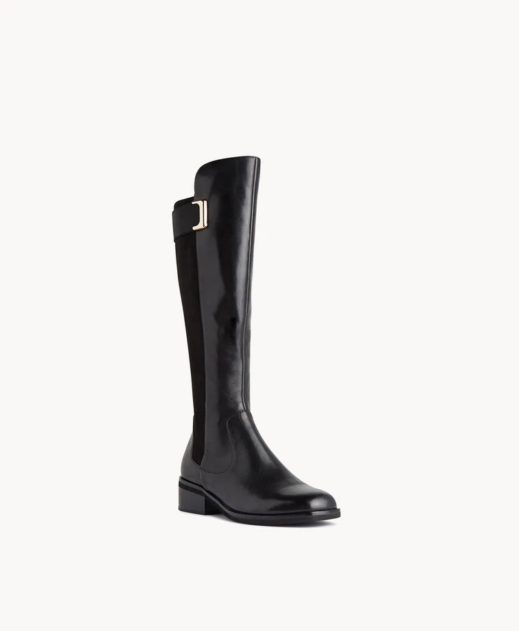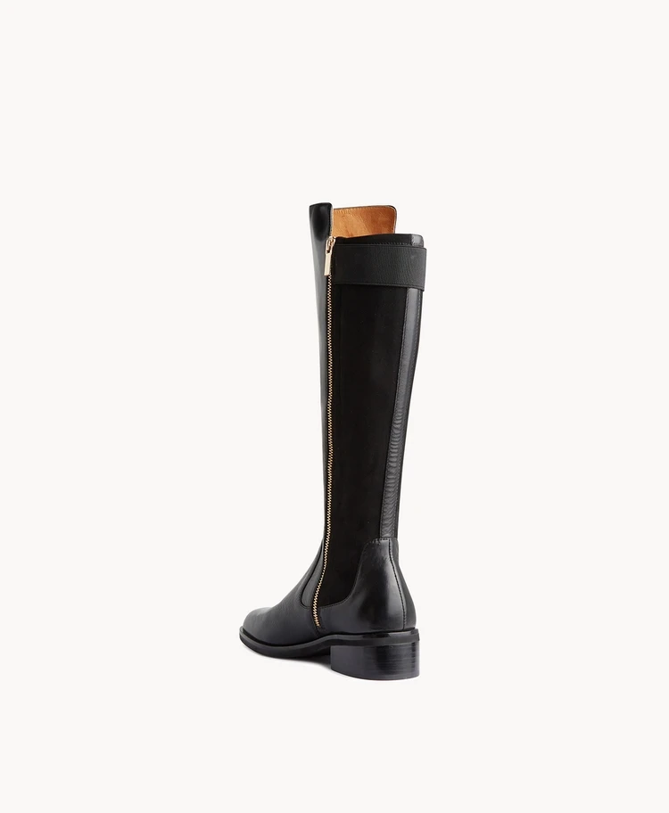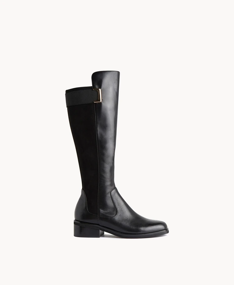 Our Priscilla knee-high boot has been modeled on equestrian styles, with a polished design that includes an elasticated suede effect back panel, and elastic trim detail. A side zip and 4cm block heel ensure all day comfort. Priscilla is sure to become your seasonal go-to.