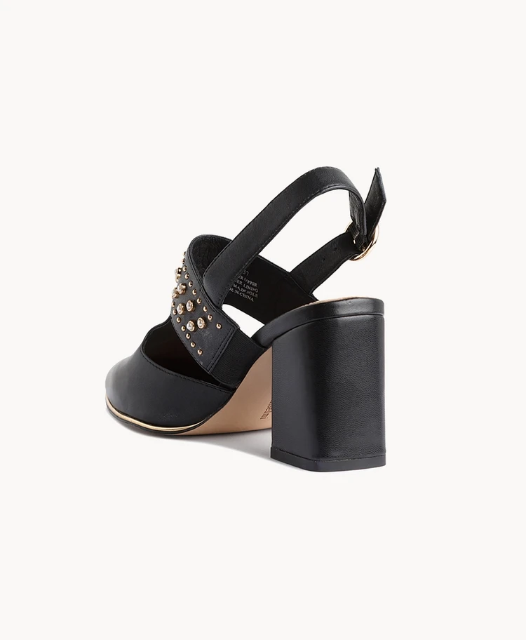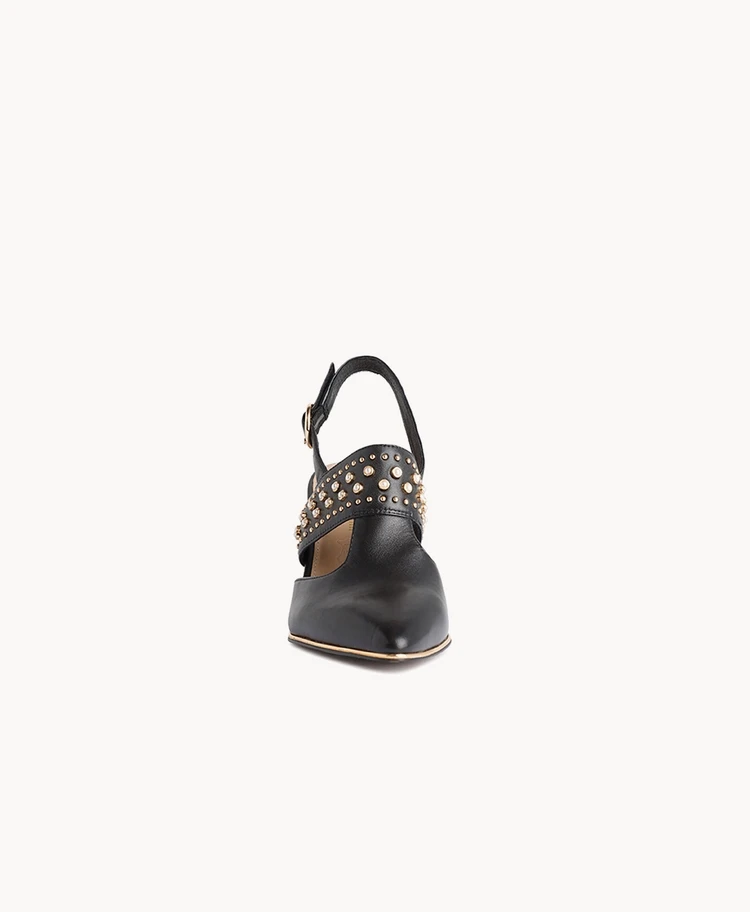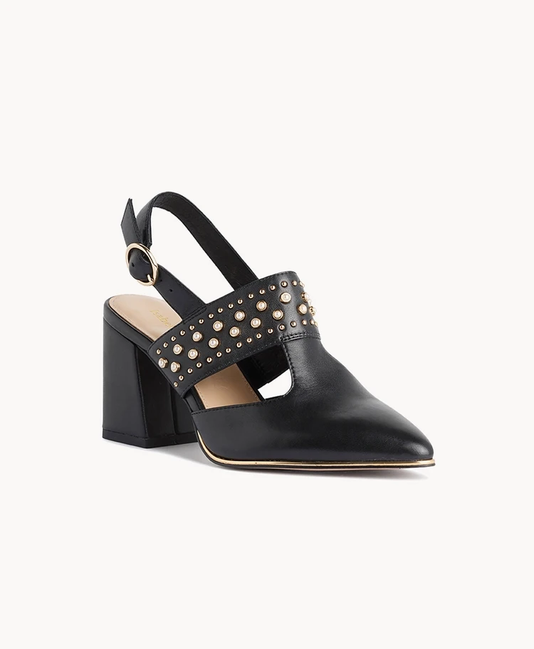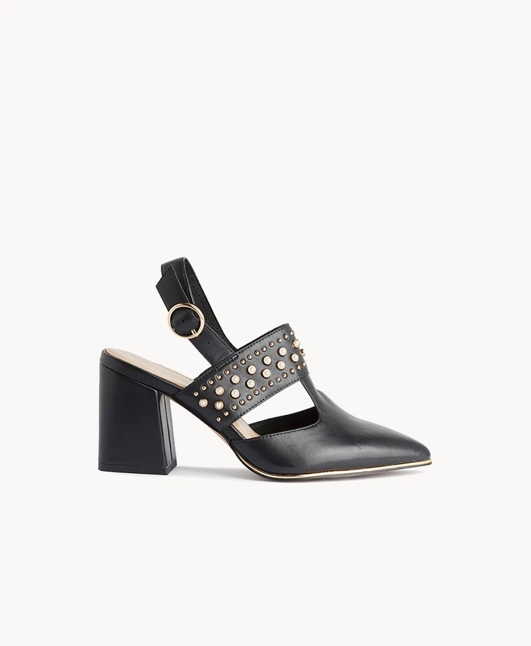A dramatic show-stopper, Siro features pearl and metallic stud detailing over the instep strap and a