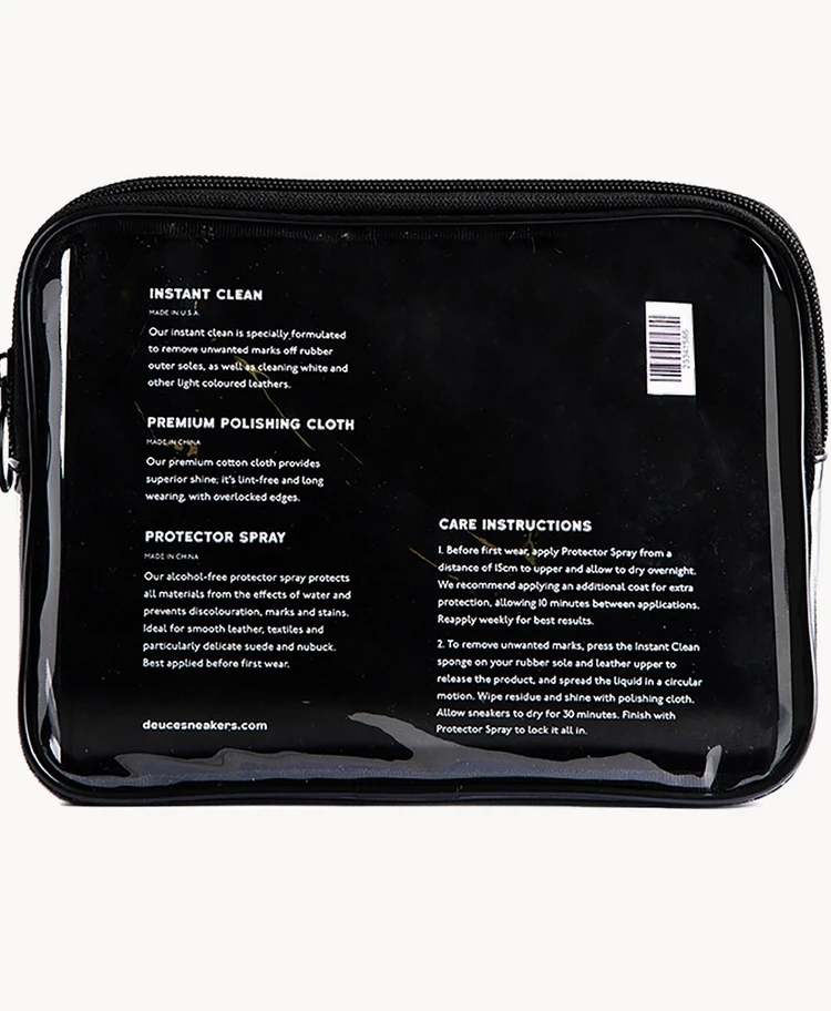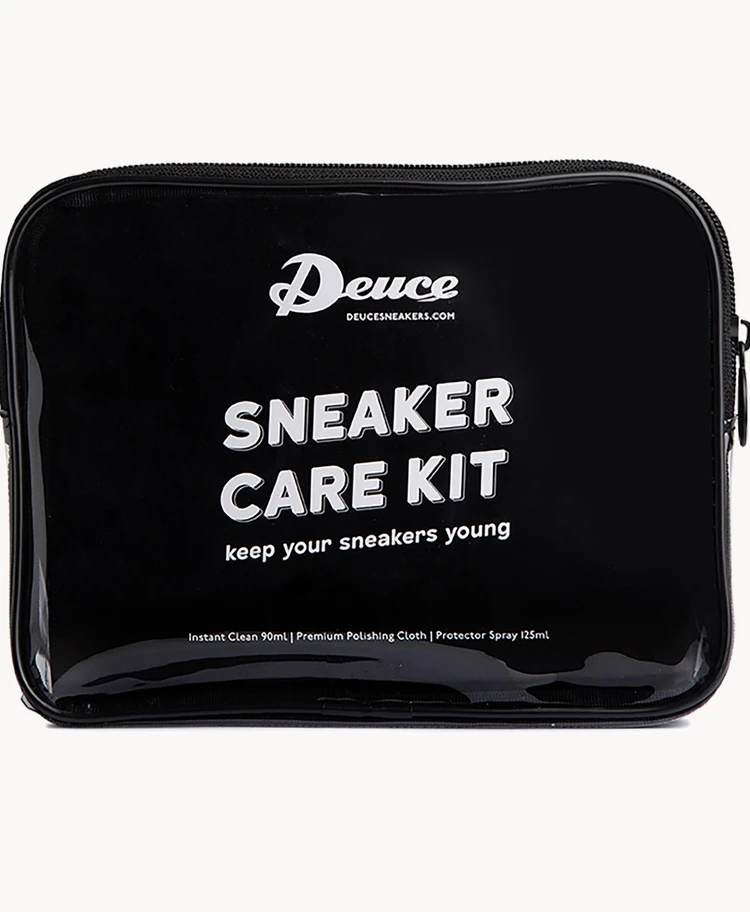 Keep your sneakers looking their best with our Deuce Sneaker Care Kit! This kit includes an Instant Clean to keep your soles and leather free of marks, a Polishing Cloth to bring up the shine and a Protector Spray for ongoing protection from moisture and scuffs.