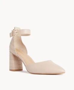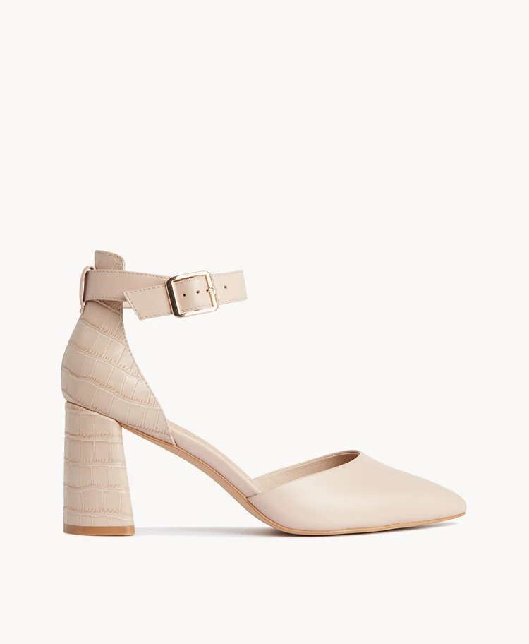 A minimal silhouette allows the Sophie heel’s details to do the talking. Croc embossed leather and a chic ankle strap make this style an elevated look for summer events.
