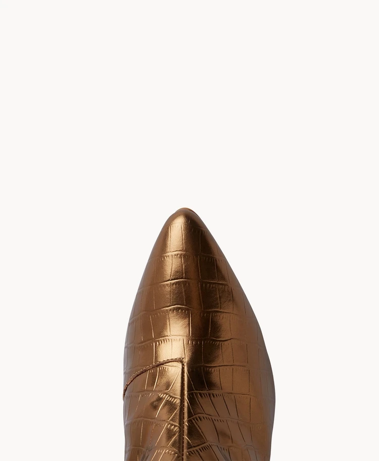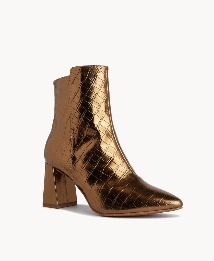 Croc embossed leather defines the Stax ankle boot, taking them from simple to sophisticated. The heel height makes them ideal for evening wear, paired with blazers for a look that speaks to confidence.