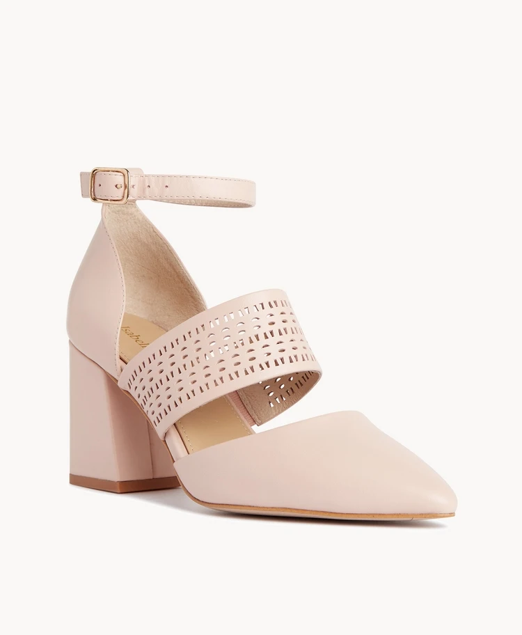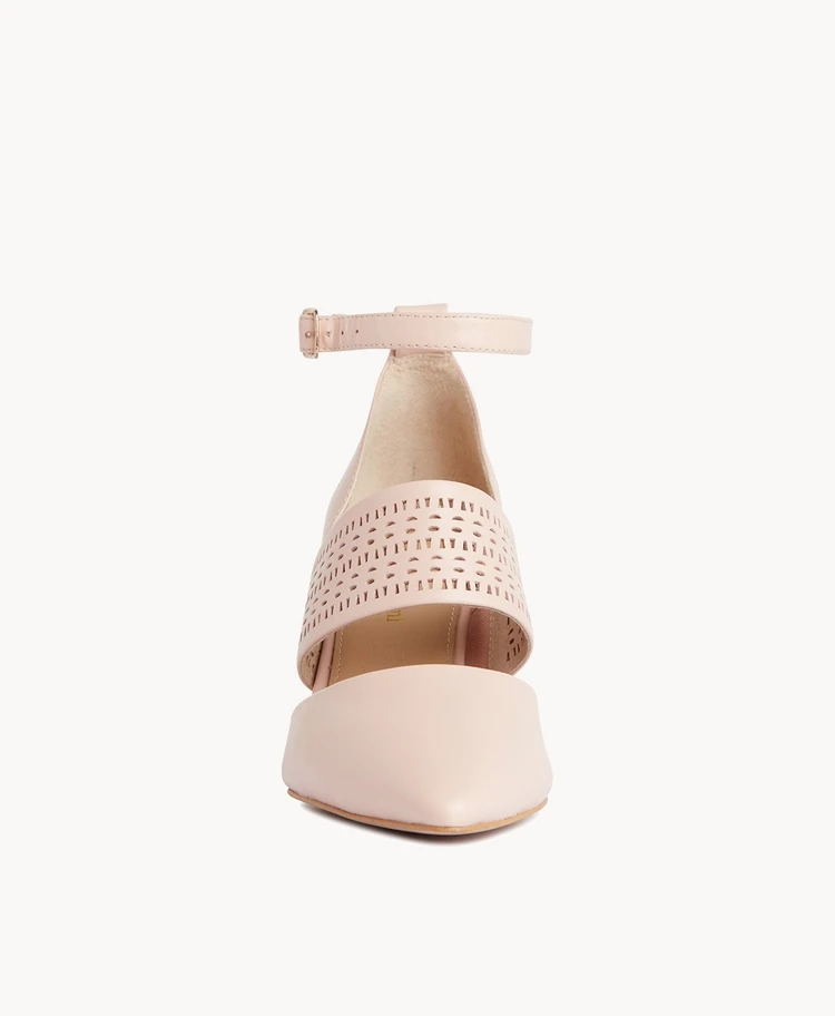 Fresh and feminine, our Sunny heel has a wide laser cut strap and block heel for maximum comfort. Wear yours with midi skirts and shorts to show off the intricate detail.
