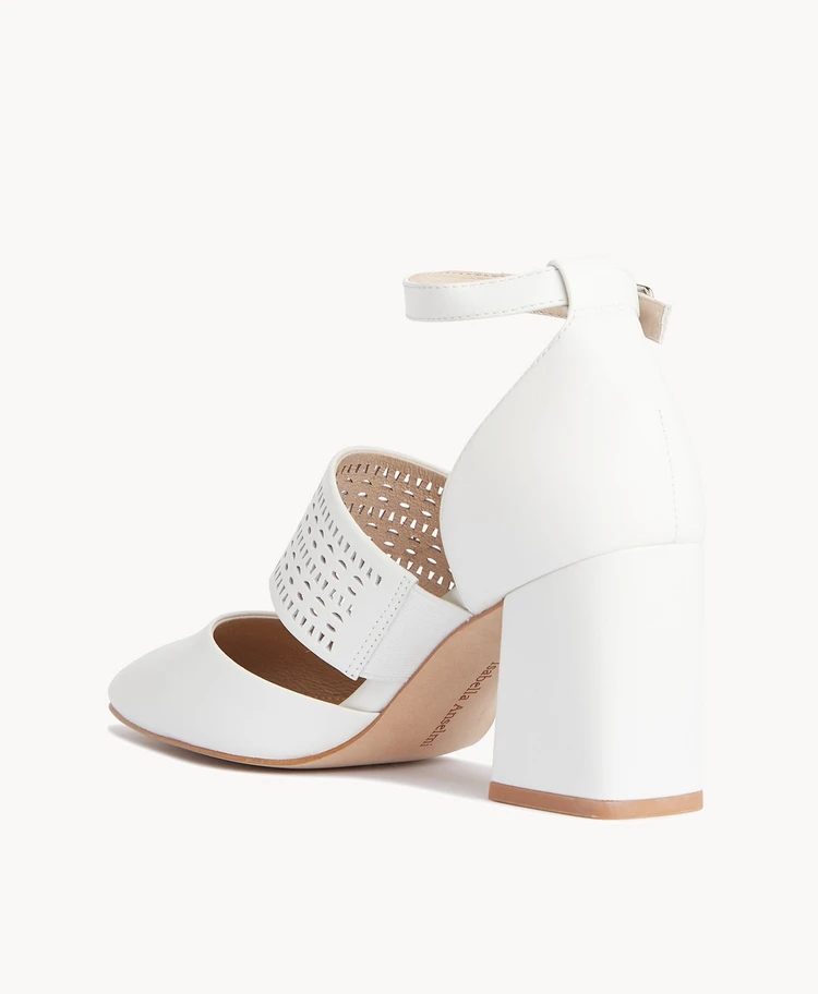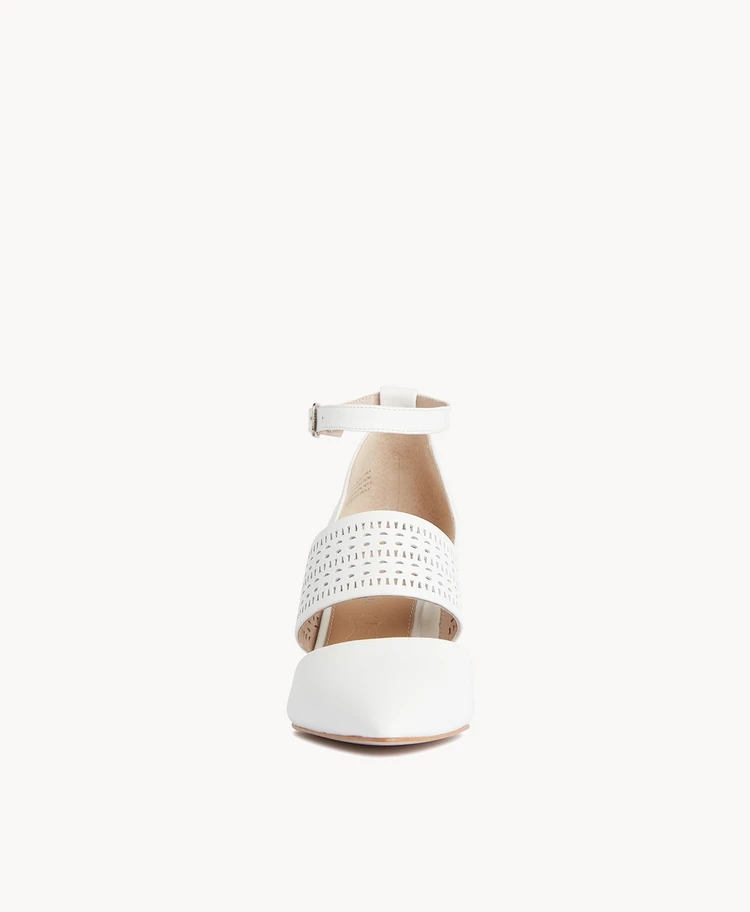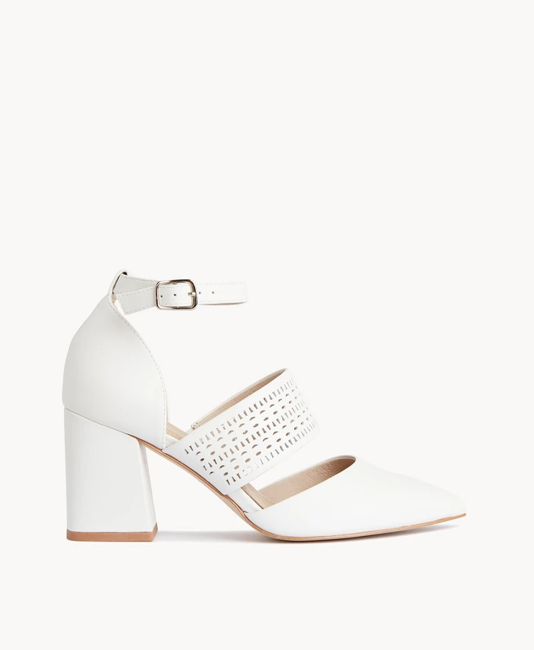 Fresh and feminine, our Sunny heel has a wide laser cut strap and block heel for maximum comfort. Wear yours with midi skirts and shorts to show off the intricate detail.